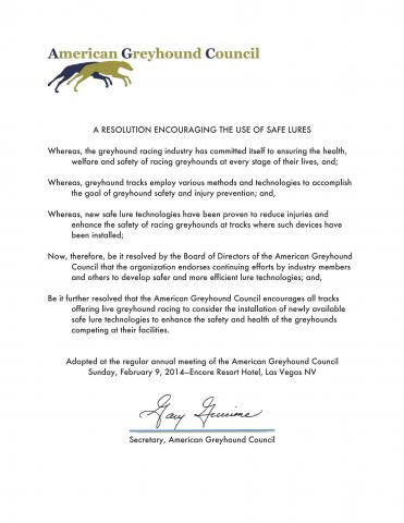 At its annual meeting on Sunday, February 9, in Las Vegas, the Board of Directors of the American Greyhound Council (AGC) adopted a resolution encouraging greyhound tracks to consider the installation of newly available safe lures to enhance the safety of racing greyhounds. The resolution also endorses efforts by industry members and others to deveop safer and more efficient lure technologies.